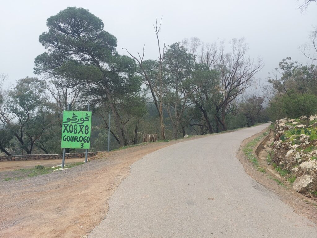 La montée vers le Mont Gourougou par une petite route très agréable, bordée de pins, en mauvais état, je crains qu’ils ne survivent pas très longtemps.