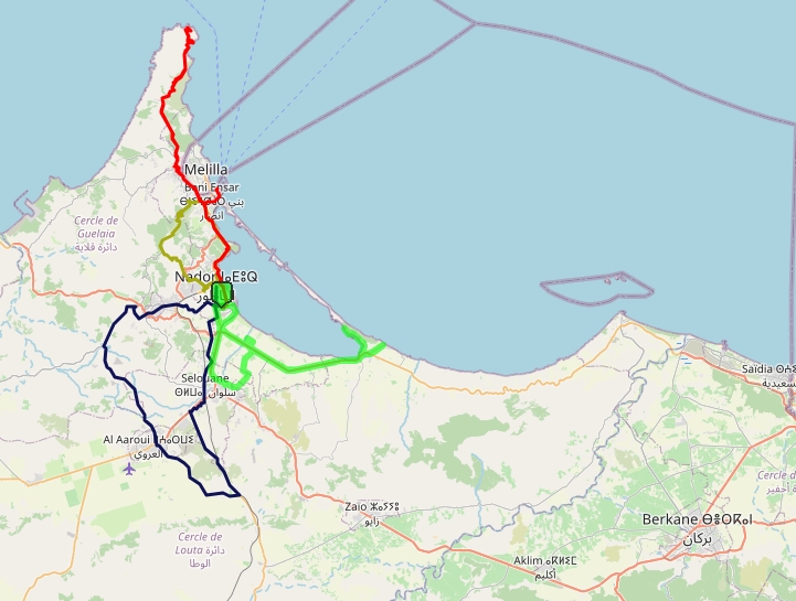 En rouge, la journée de dimanche; en bleu, la boucle de lundi; en vert, la découverte de la lagune de Nador; En marron, l’ascension du Mont Gourougou.