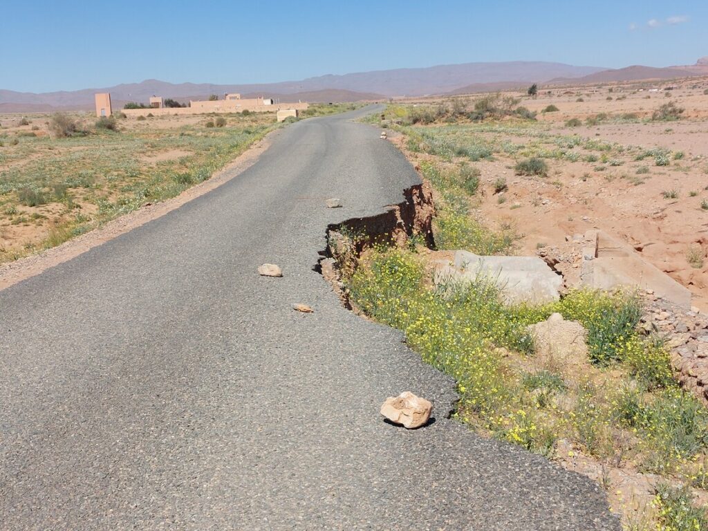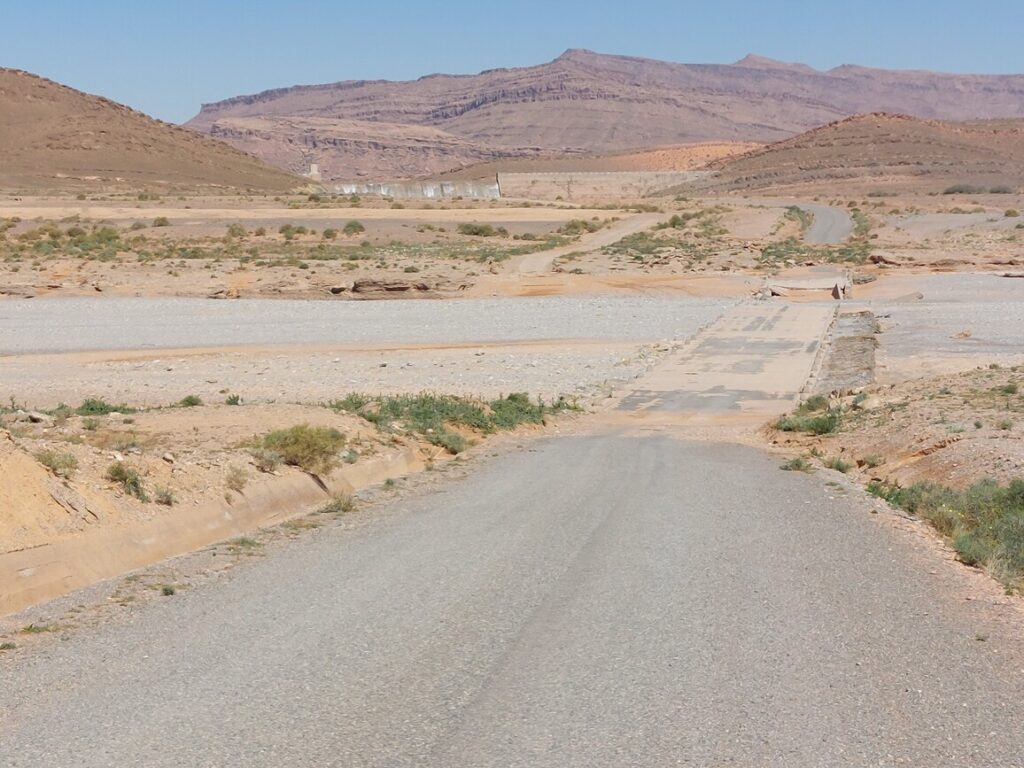La route par laquelle je suis arrivé continue vers un deuxième barrage un peu plus haut, mais le pont (le gué) qui permet de franchir l’oued Salsaff est écroulé, cela n’empêche les mobylettes de franchir l’oued. Je ne les ai pas vu traverser, j’étais trop loin, mais je les ai vu de l’autre côté remonter la côte. Il doit y avoir un ou plusieurs villages plus loin.