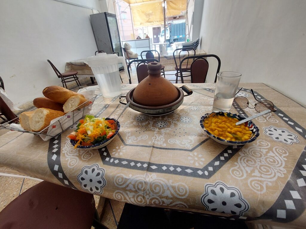 Déjeuner à 15h. Dommage j’ai oublié d’ouvrir la tajine. Miam ! Noter la carafe d’eau. Je pense qu’à Figuig on est fier d’avoir l’eau du barrage de Sfissef. Comme Bouarfa, Figuig est une ville très propre, pas un papier ne traîne.