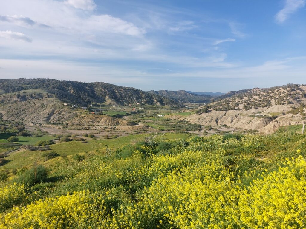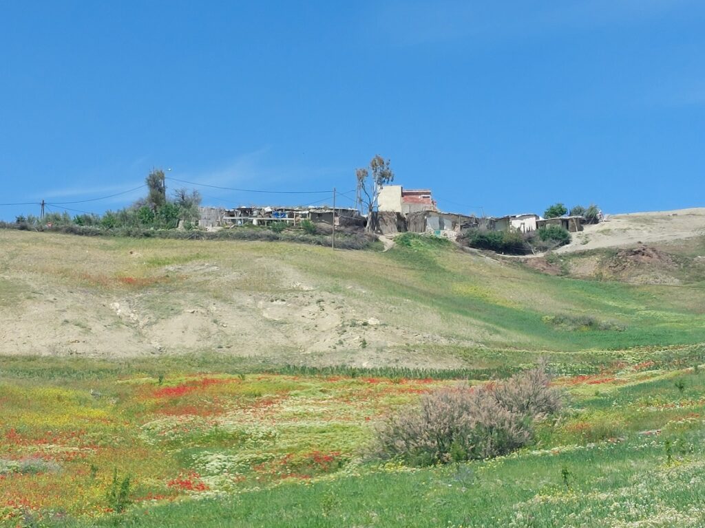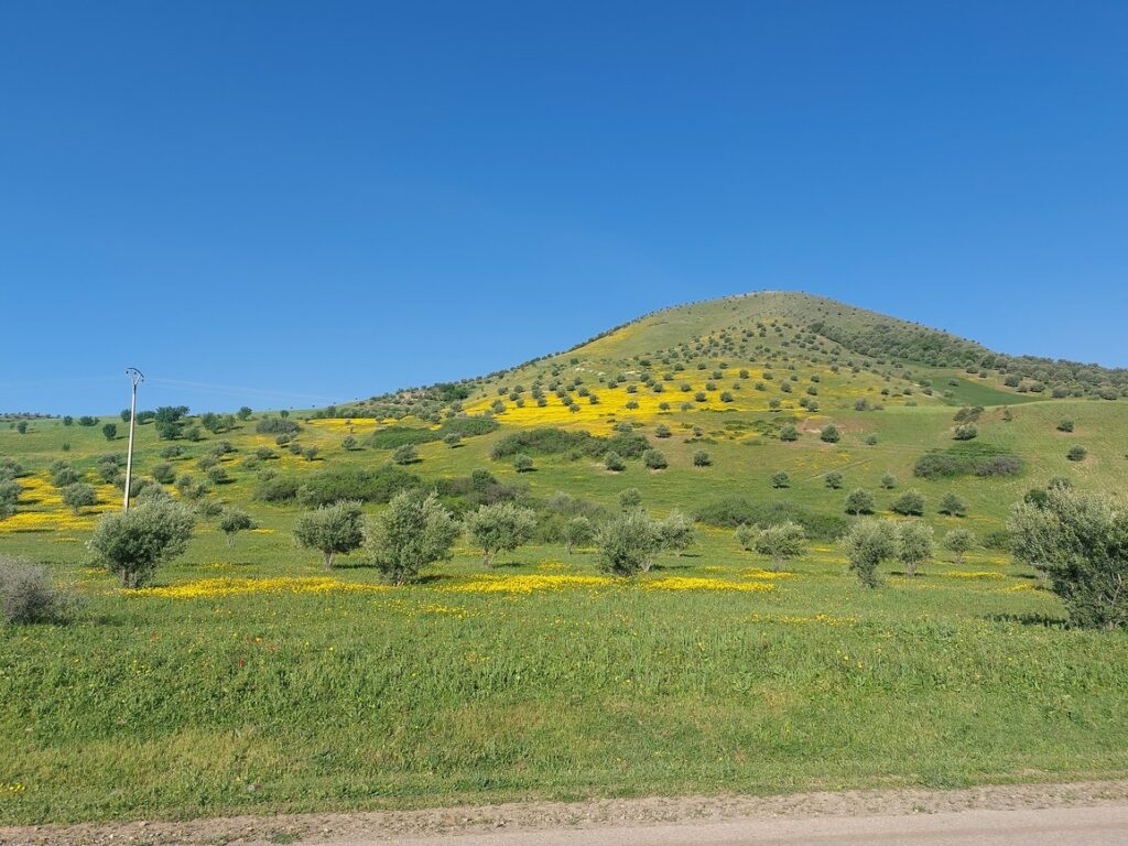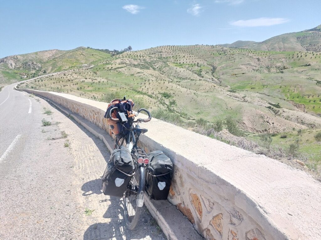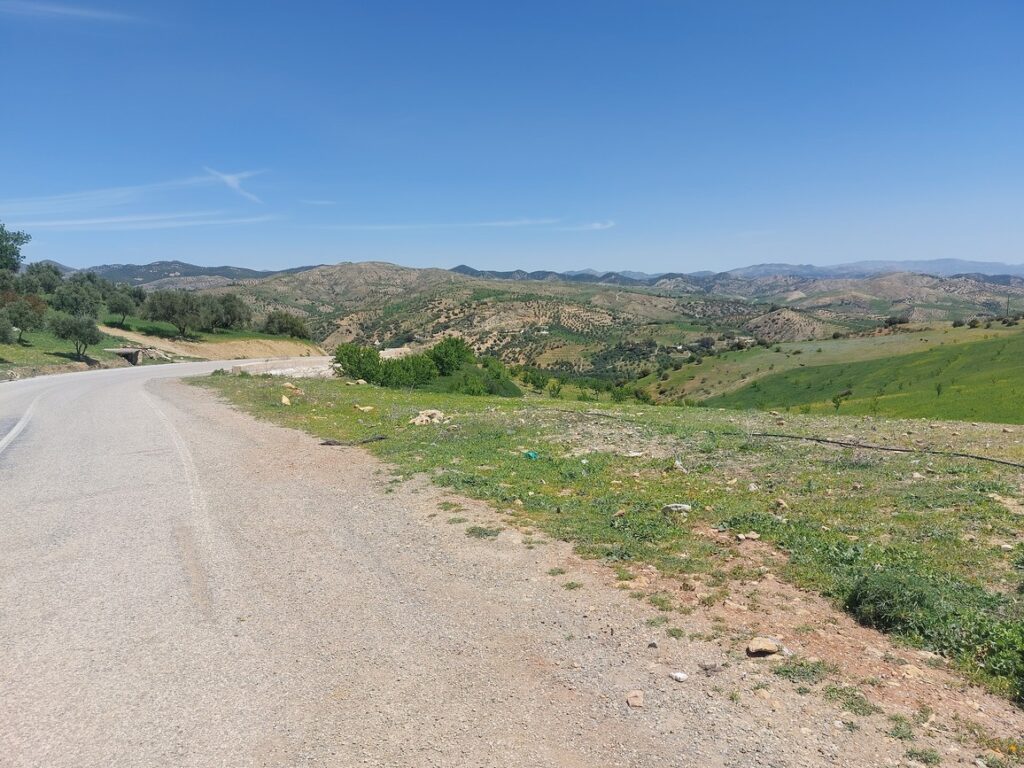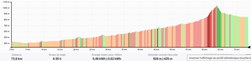 Le profil du jour, beaucoup de montées-descentes (ce que ne rend pas bien le profil), mais en pente douce, rien à voir avec hier. Un col à 1034 mètres en fin d’étape, col auquel on arrive en montant doucement, mais les derniers kilomètres depuis Beni Ftah sont assez raides.