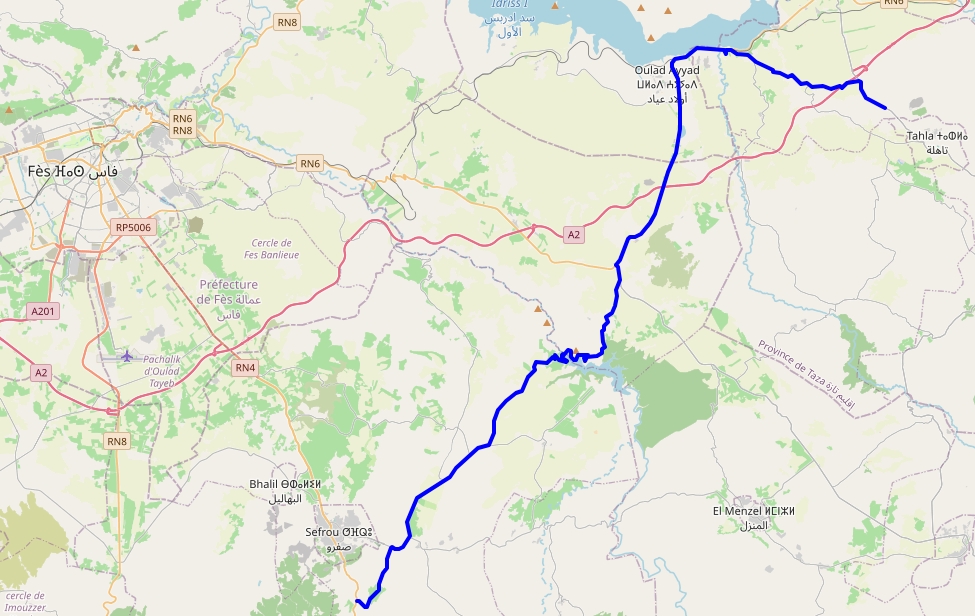 Le profil de l’étape du jour, 550 mètres de dénivelé pour passer un col à 1800 mètres d’altitude, belle descente sur Sefrou, puis une petite remontée pour revenir à mon hôtel à 5 km en amont de Sefrou.