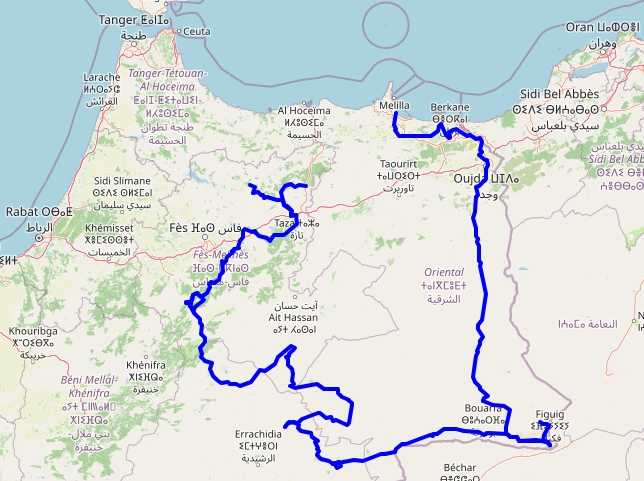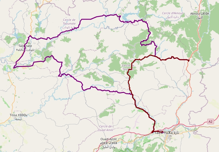 En bas, c’est Taza, à l’autre extréminté de la courbe marron, c’est Bjarna, mon étape du jour. En violet (début en marron et fin en marron, c’est l’itinéraire Taza-Bjarna qui était prévu en 4 jours avec un jour de repos à Aïn Mediouna. Aujourd’hui devait être jour de repos, et il me restait deux jours pour rejoindre Bjarna.
