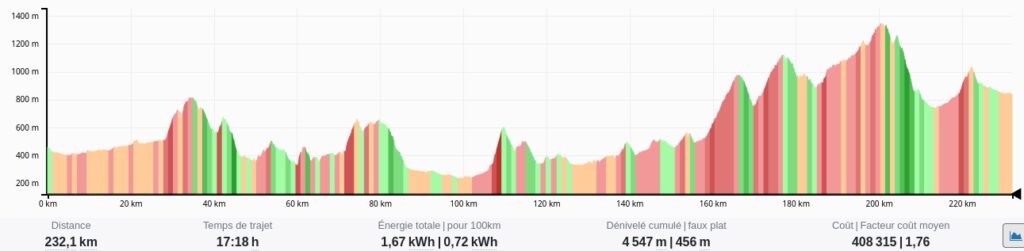 Le profil de la route Taza-Bjarna que j’aurai du faire en 4 jours avec une journée de repos à Aïne Mediouna au kilomètre 82, et il me restait deux étapes de 76 kilomètres avec nuit à Thar-Es-Souk, hébergement non identifié, rie sur Booking, AirBnb, Google Maps. Le profil du dernier jour peut apparaître impressionnant, mais il n’y a pas plus de dénivelé positif que dans mon étape prévue hier.