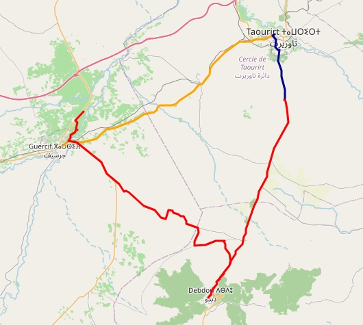 En marron, mon itinéraire à vélo de Boudnib à Midelt (sauf les 20 derniers kilomètres) et en rouge mon itinéraire en grand taxi. Je remonte vers Nador en zigzaguant.