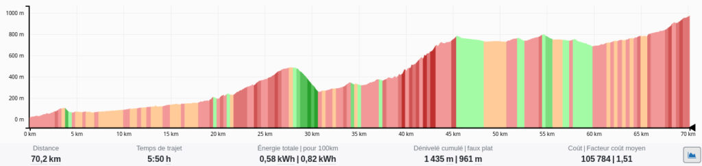Profil réalisé – 70 kilomètres – 1435 mètres de dénivelé positif. Pas de grosse différence. 2 kilomètres en plus. 65 mètres de dénivelé en plus et une descente très très raide sur une toute petite route de mauvaise qualité.