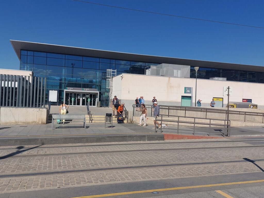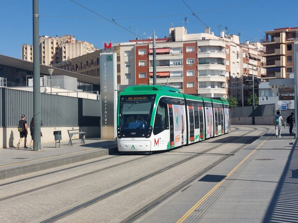 Le métro de Grenade devant la gare. Il s’enfonce sous terre un peu plus loin.