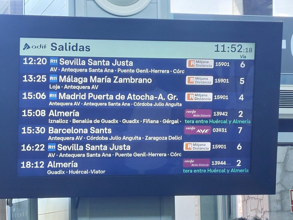 Peu de trains … En fait il n’y a que deux lignes, une pour Almeria et une vers Cordoue et Malaga qui se séparent à Antequera. Pour rejoindre Madrid et Barcelone, il faut passer par Cordoue.