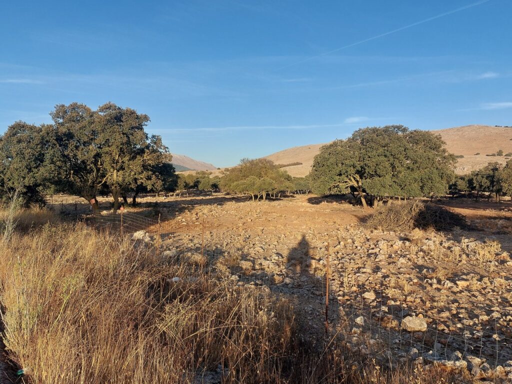 Paysage en approchant de Ventas de Zafarraya. Champ de cailloux et chênes verts sous lesquels paissent des moutons.