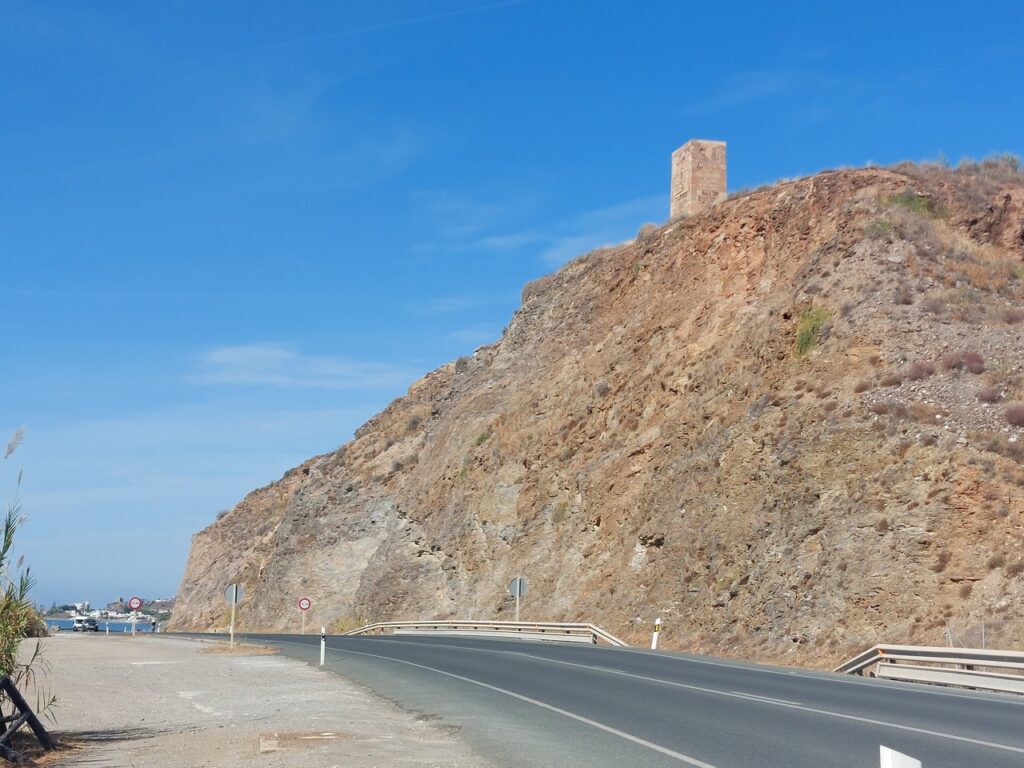 Nombreux édifices de fortification de la côte tout le long de la route qui longe la mer vers Malaga. Ici Torre del Jarral.