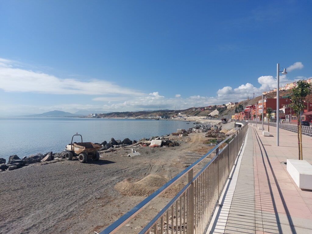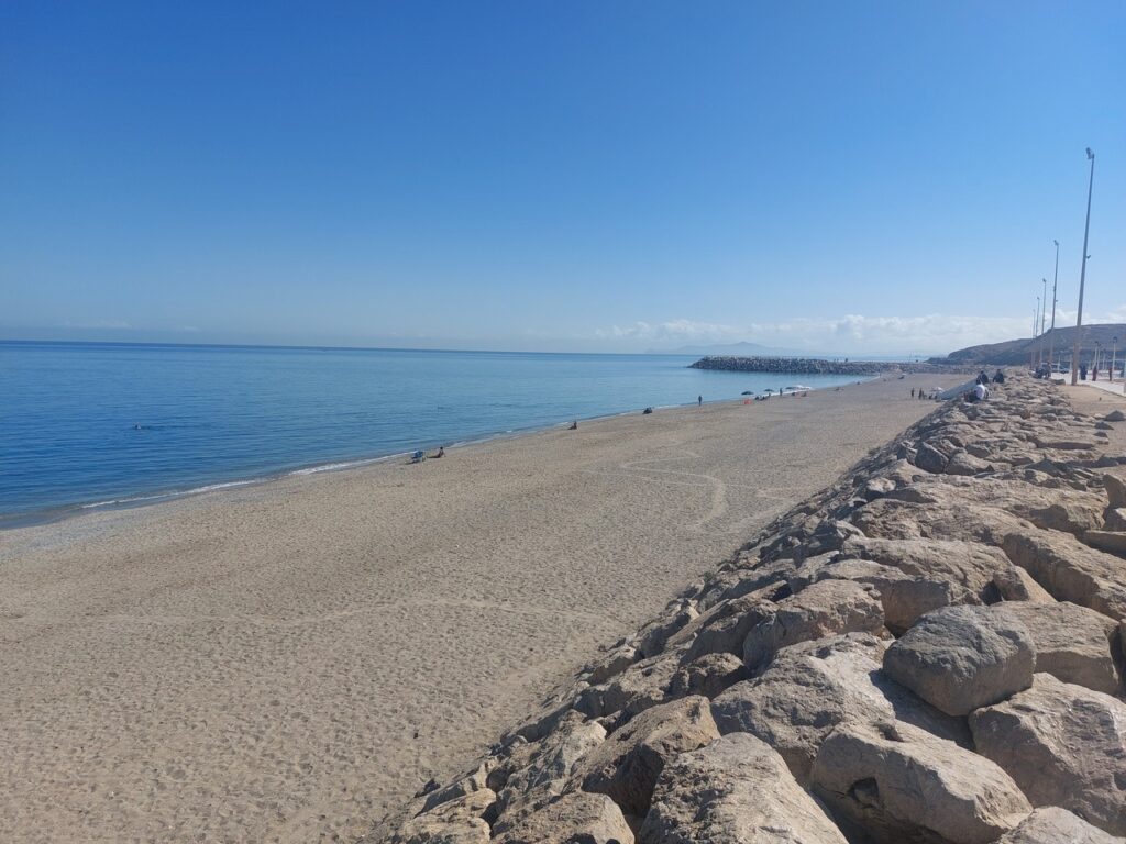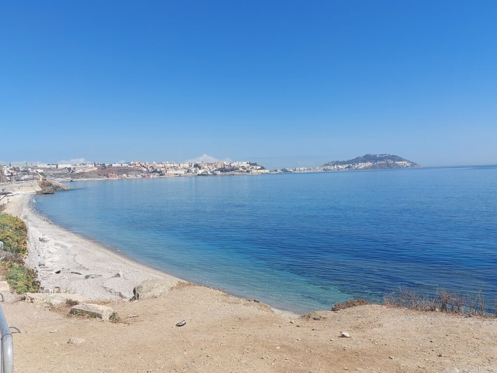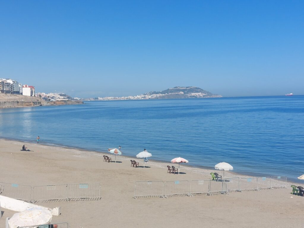 Plage vers le nord de Fnideq, au fond, c’est Ceuta.