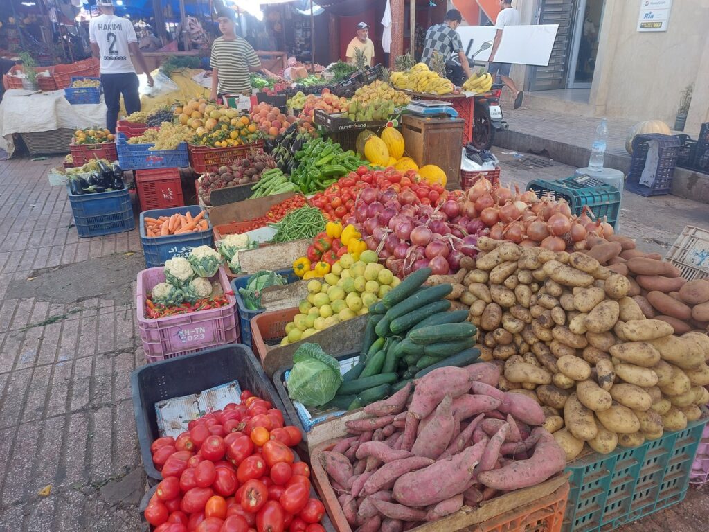 Étal de fruits et légumes au marché.