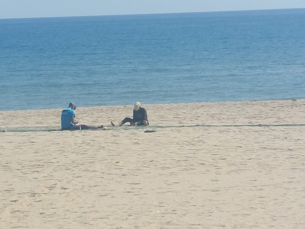 Pêcheurs ramendant leur filet, mais je n’ai pas vu le bateau.