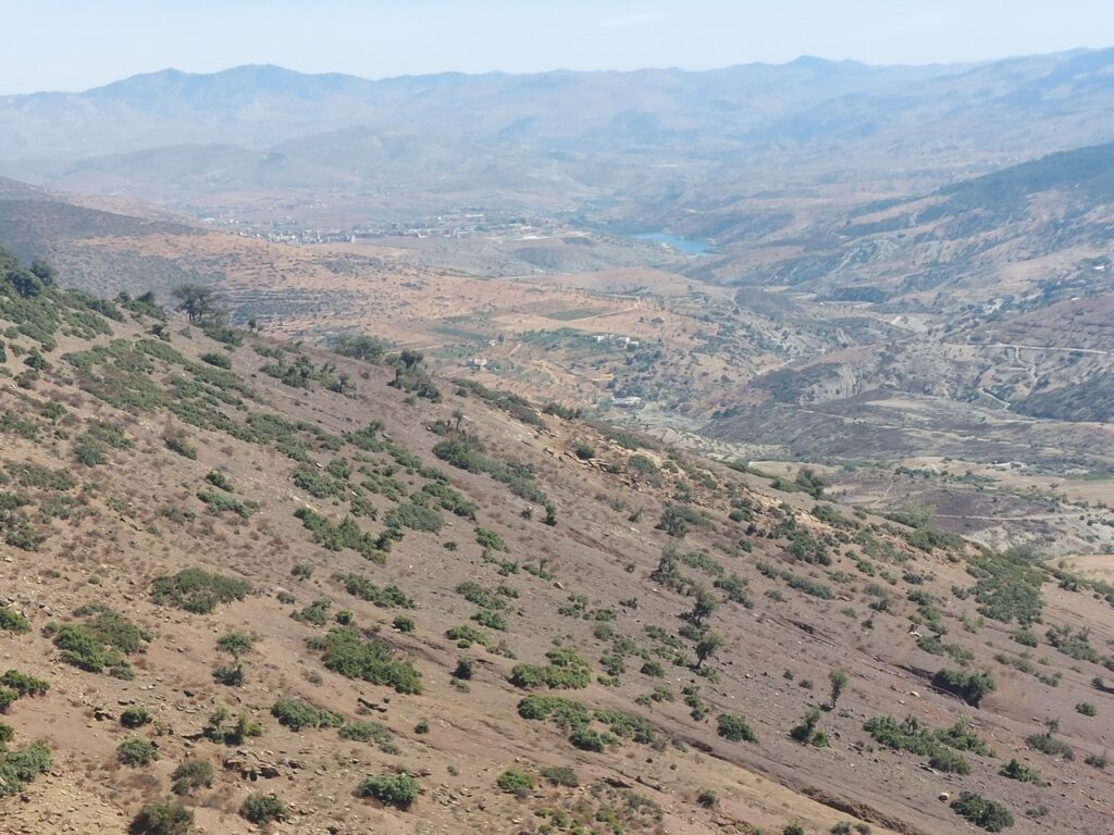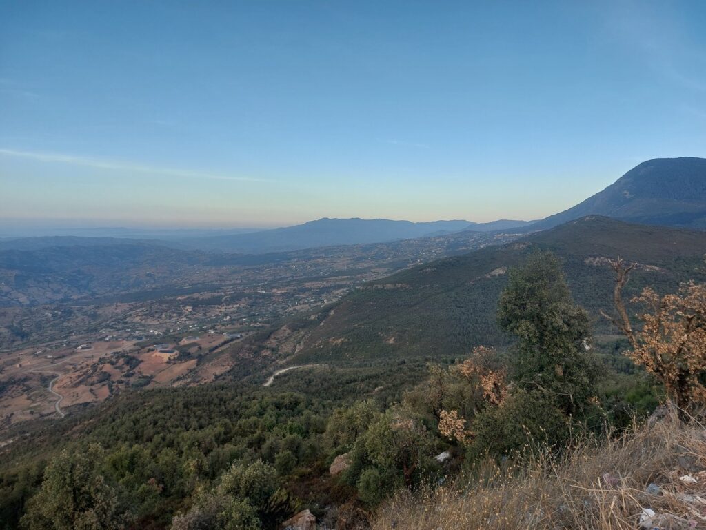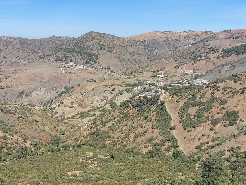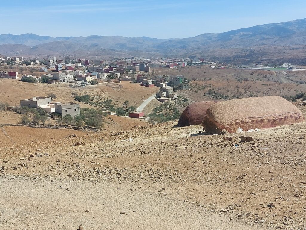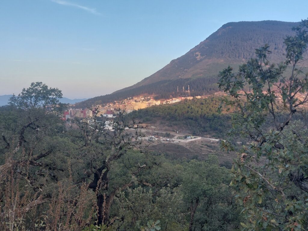 J’ai pris un petit-déjeuner local (marocain) dans un café à Issaguen (2 oeufs sur le plat, un quartier de vache qui rit, un ravier de mélange d’olives vertes et noires, et de l’huile d’olive, le tout avec une demi-galette de pain pour éponger le tout). Mais j’ai oublié de prendre une photo de la ville elle-même. En sortant, je suis très étonné de voir un énorme chantier d’urbanisation (on en voit ici qu’une petite partie). Issaguen est le seul village entre Bar Bered et Targuist. Il est en train de se transformer en ville, mais avec quels habitants ?