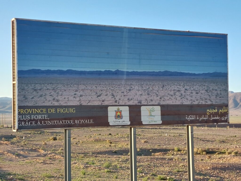 Écriture Arabe et écriture Tifinaghe, mais je n’identifie pas le nom de la localité, ce doit être Figuig, mais en général cela ne s’écrit pas comme ça.