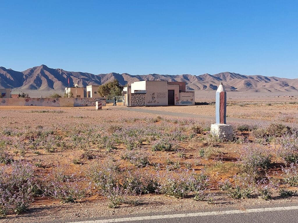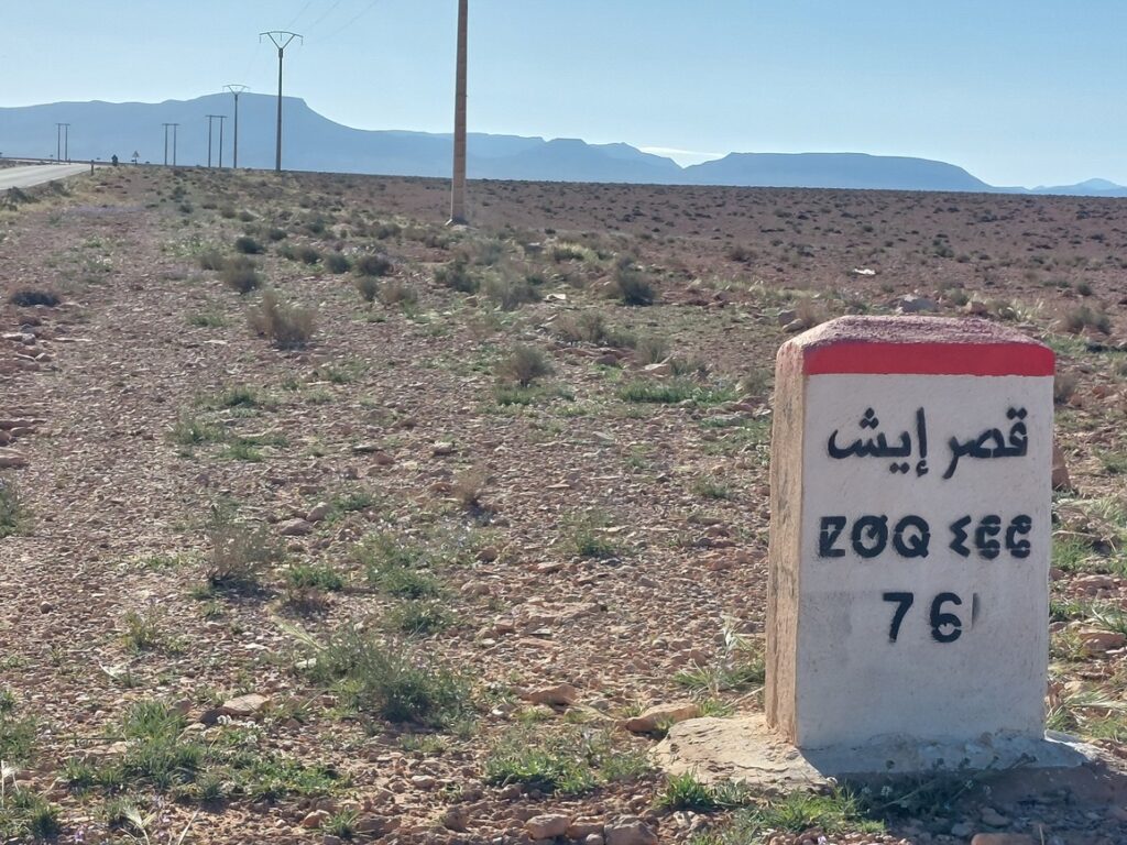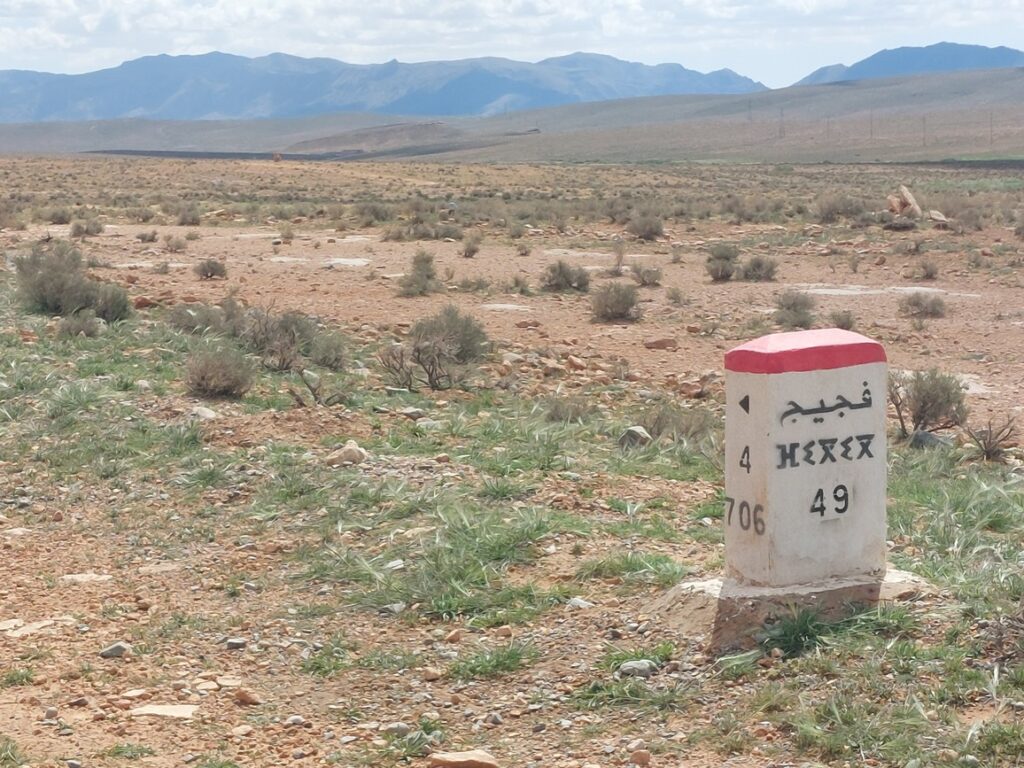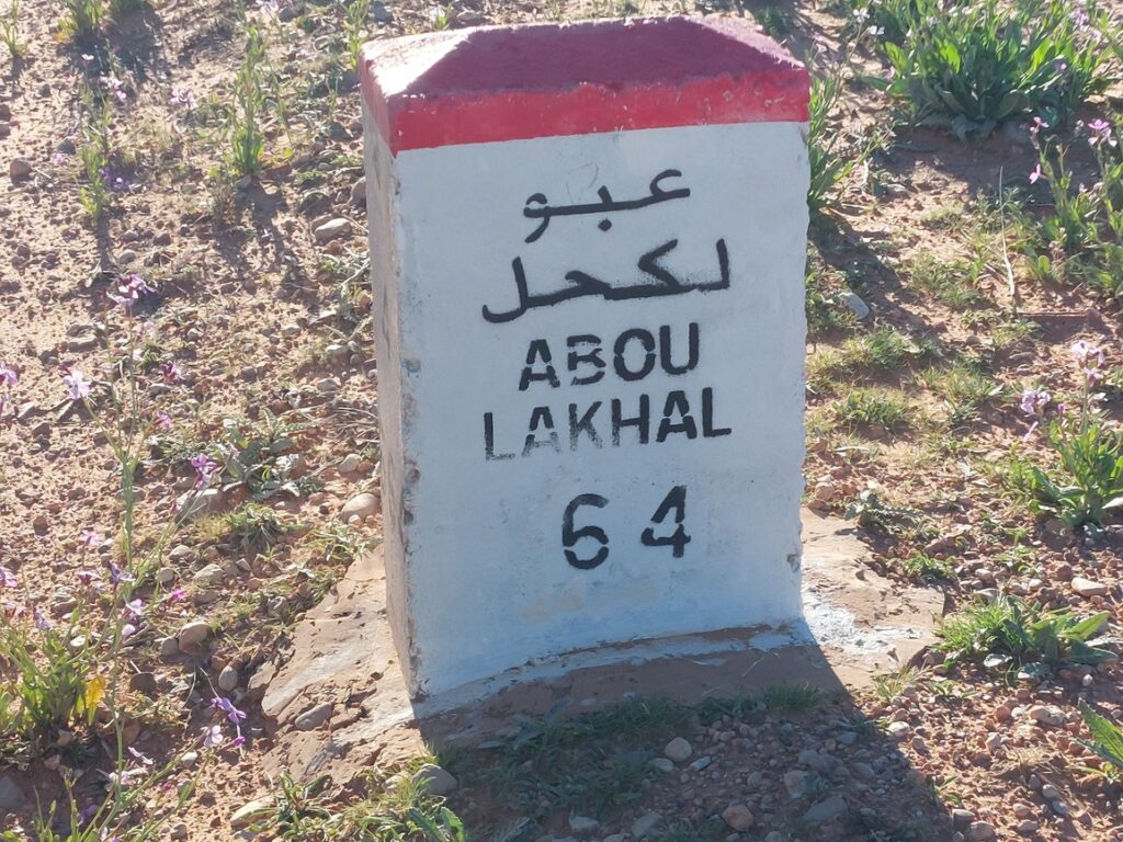 Borne routière. Abou Lakhal est un tout petit village à 25 km avant d’arriver à Figuig.