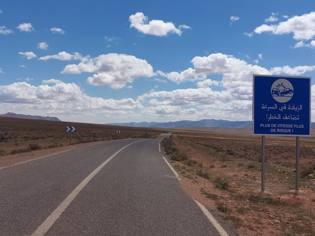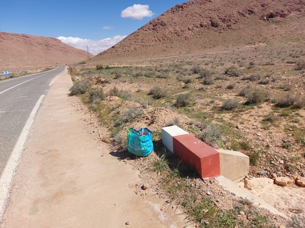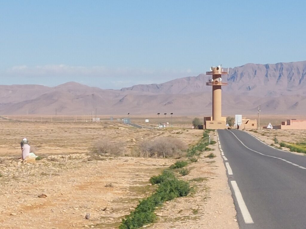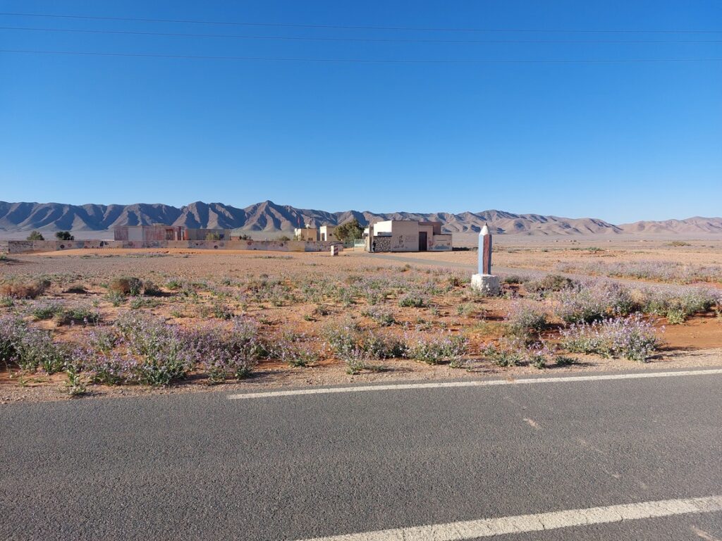 Borne routière. Abou Lakhal est un tout petit village à 25 km avant d’arriver à Figuig.