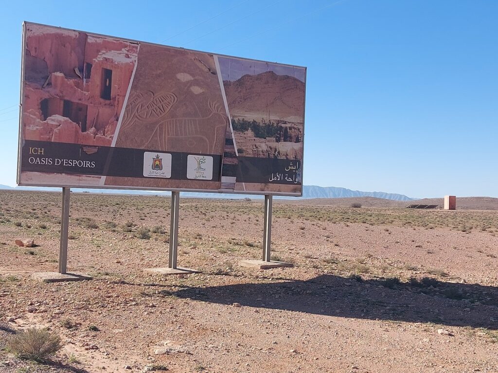 Ich – Oasis d’espoir. Ich n’st pas sur ma route, c’est à 75 km en prenant une bifurcation sur la gauche. C’est à la frontière avec l’Algérie. Un coin très très reculé.
