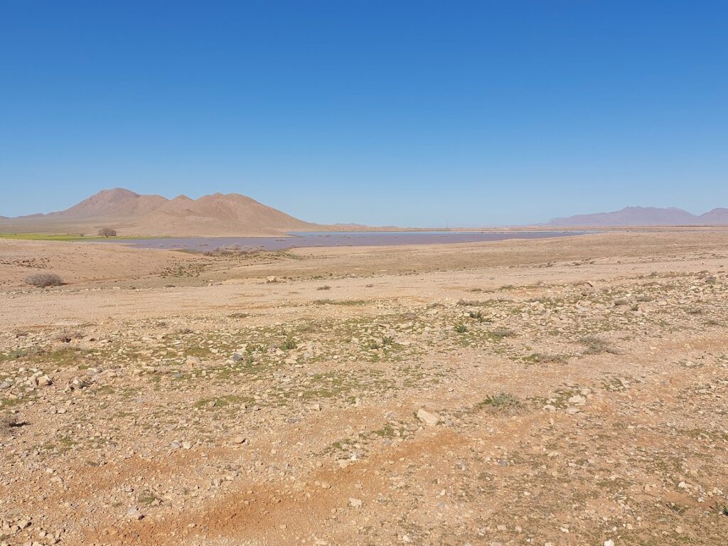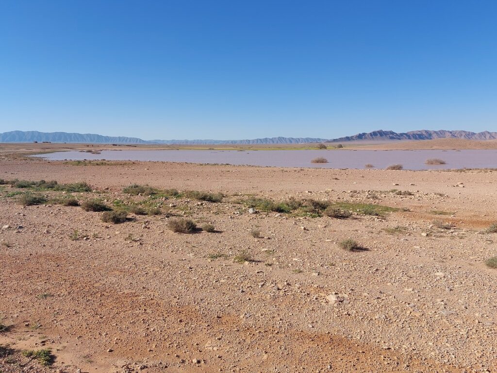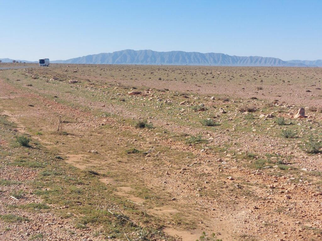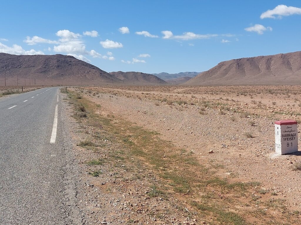 Paysage. La borne signale le barrage de Sfissef accessible par une route goudronnée, il faut passer par Figuig et c’est 30 kilomètres au nord de Figuig.