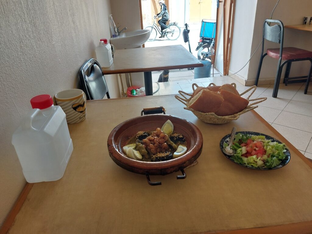 Mon déjeuner, une excellente tajine de mouton aux pruneaux et raisins secs avec une salade marocaine. Noter l’eau du robinet et le mug.