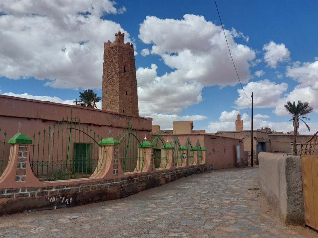 Le minaret pierreux octogonal de la mosquée Ouled Ziyane. Il daterait du VIème siècle de l’hégire (XIIème après JC). L’hégire désigne traditionnellement le départ de Mahomet et de plusieurs de ses compagnons de La Mecque vers l’oasis de Yathrib, ancien nom de Médine, en 622. Cet événement est considéré par les récits traditionnels comme une rupture fondamentale avec la société telle qu’elle était connue des Arabes jusqu’alors. Mahomet vient en effet de rompre un modèle sociétal établi sur les liens du sang (organisation clanique), en faveur d’un modèle de communauté de destin fondée sur la croyance. Dans ce nouveau modèle, où tout le monde est censé être « frère », il n’est plus permis d’abandonner le démuni ou le faible comme c’était le cas auparavant.