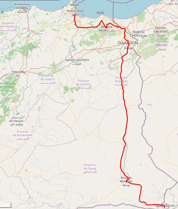 En rouge mon itinéraire depuis Nador,
