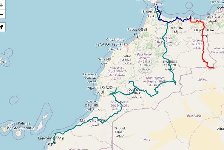 En rouge mon itinéraire depuis Nador, en bleu foncé, mon itinéraire en octobre 2025 de Ceuta à Nador; en émeraude mon itinéraire en octobre 2019 de Tanger à Laayoune.