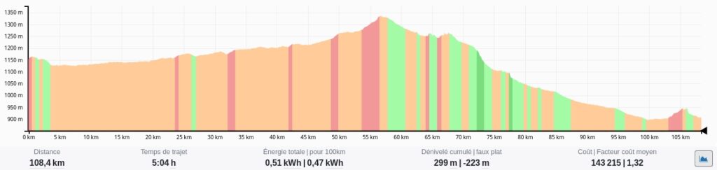 Le profil de mon étape du jour : un col à 1335 mètres. Fin d’étape à 900 mètres d’altitude.
